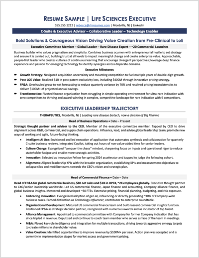 A transformational resume for a gamechanging leader, former CFO turned AI enthusiast, this resume launched his post-big pharma start-up and PE-backed career.